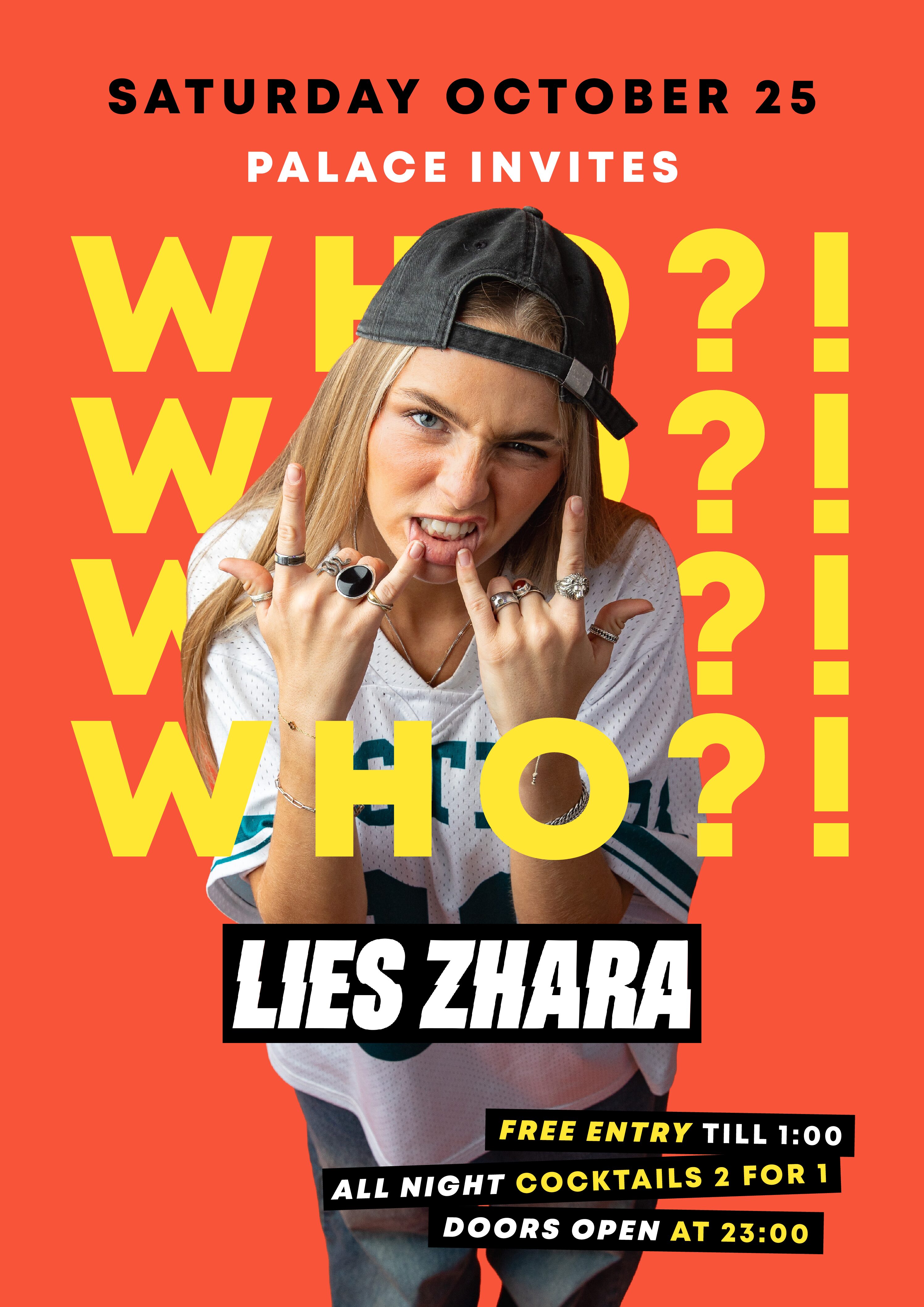 Lies Zara is niet te stoppen! Van YouTube en social media naar de draaitafels: ze laat overal zien hoeveel talent ze in huis heeft. Met haar energie en charme zet ze nu ook als DJ de zaal in vuur en vlam. En geloof ons: op zaterdag 25 oktober bij haar set in PALACE wil je vooraan staan!